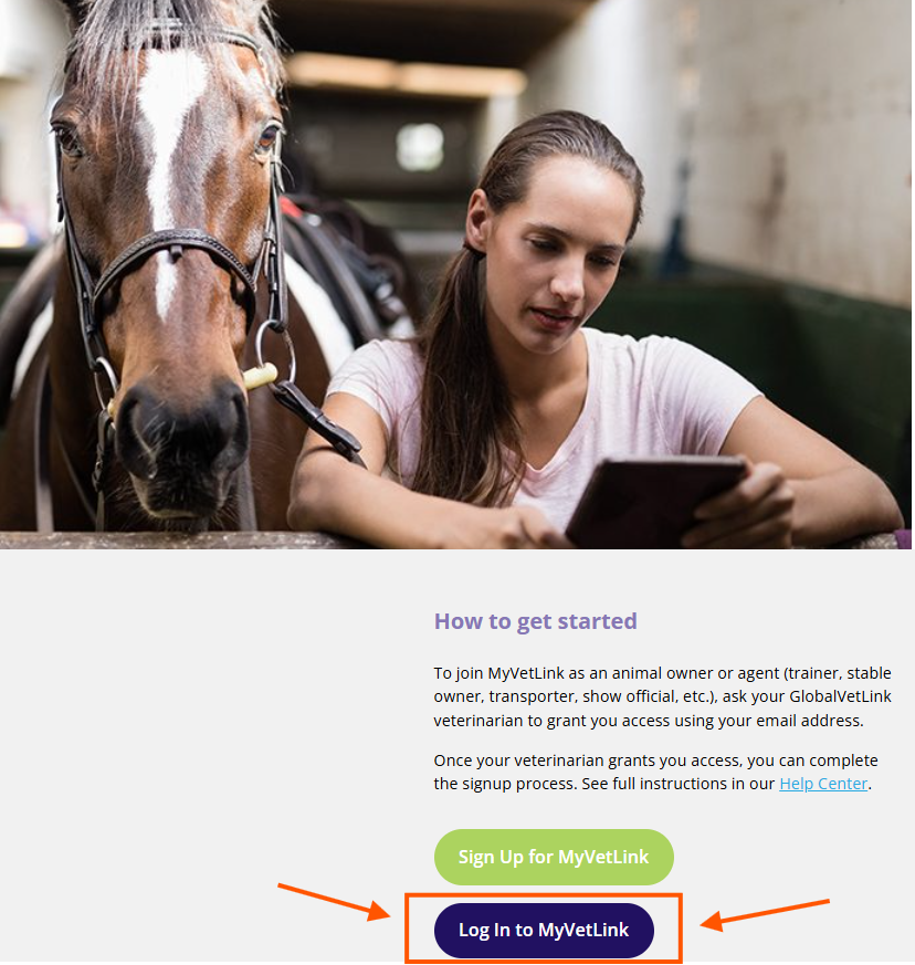 To access your MyVetLink account, visit www.myvetlink.com — the login option is located beneath the animal owner and horse image on the homepage.