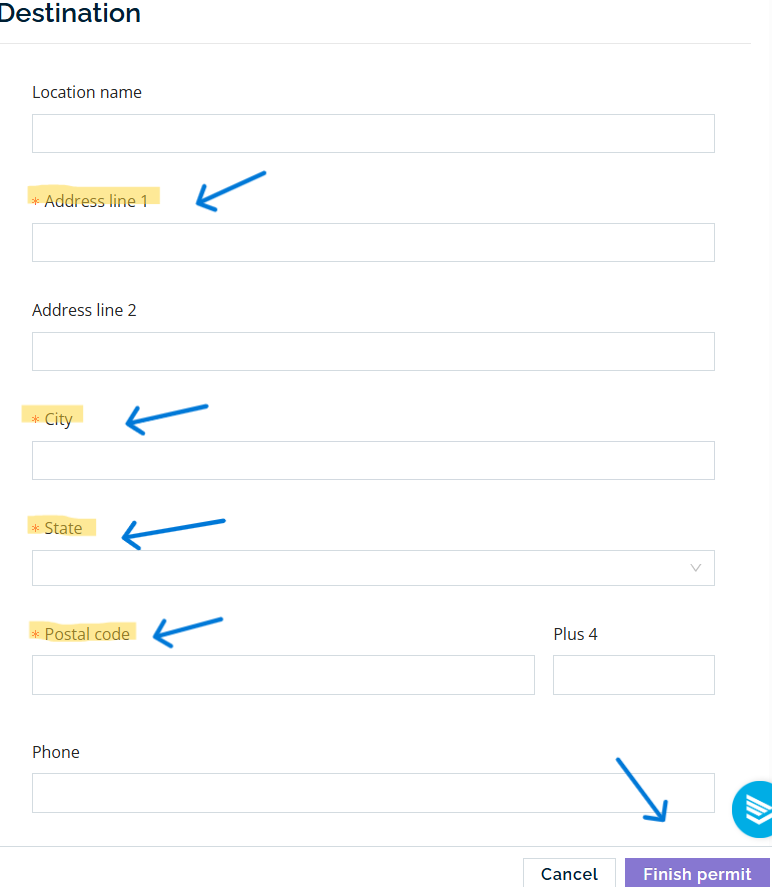 The destination address is where the animal will be going. Once all information has been entered, select Finish Permit.
