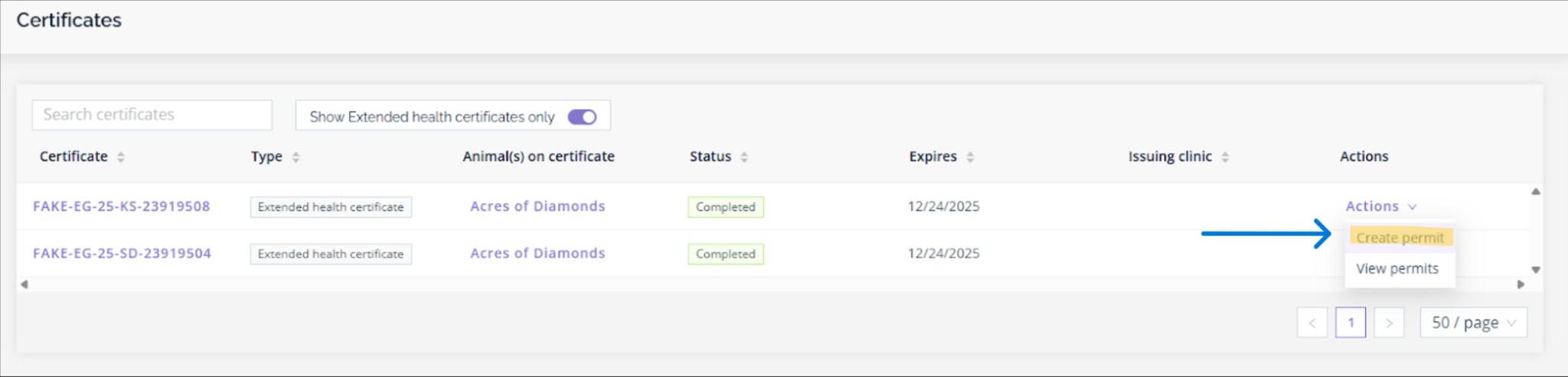 Locate the EECVI you need to make a permit for. To the far right of the certificate, select Actions → Create Permit.