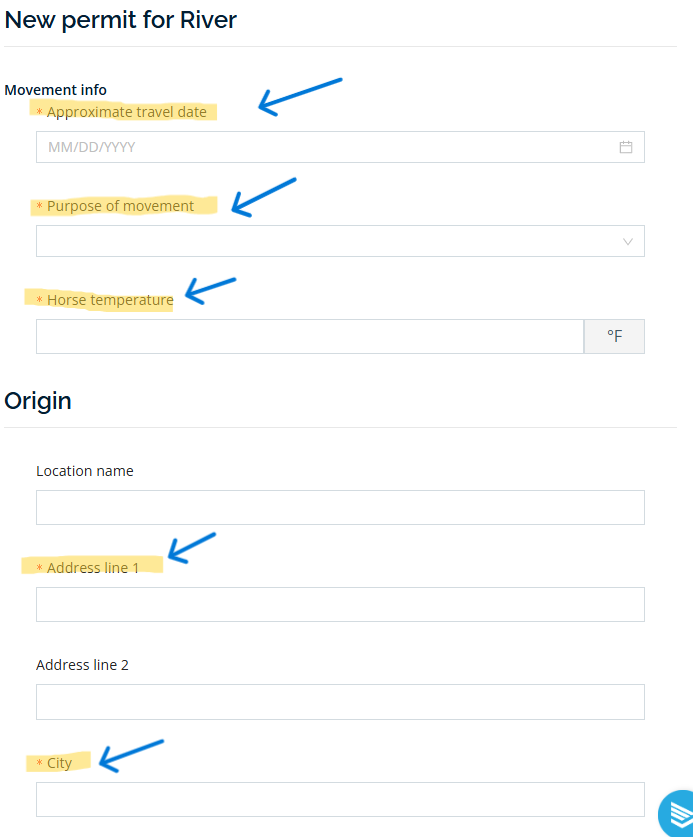 Enter the required information to create the permit. The origin address is where the animal is leaving from, such as a boarding facility.